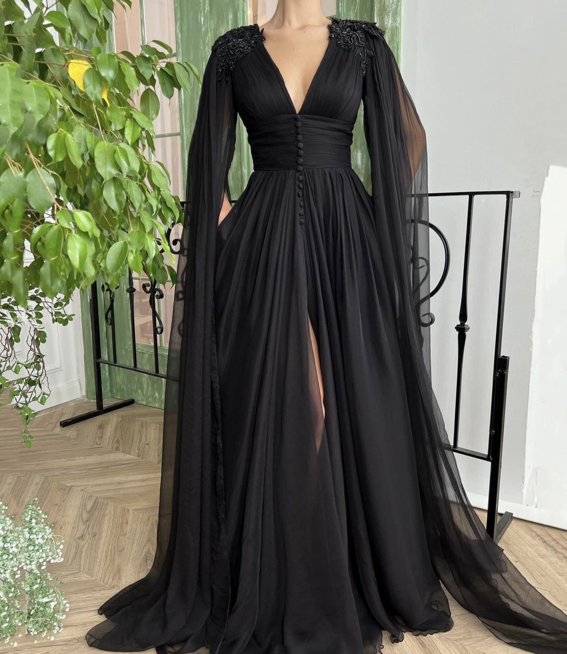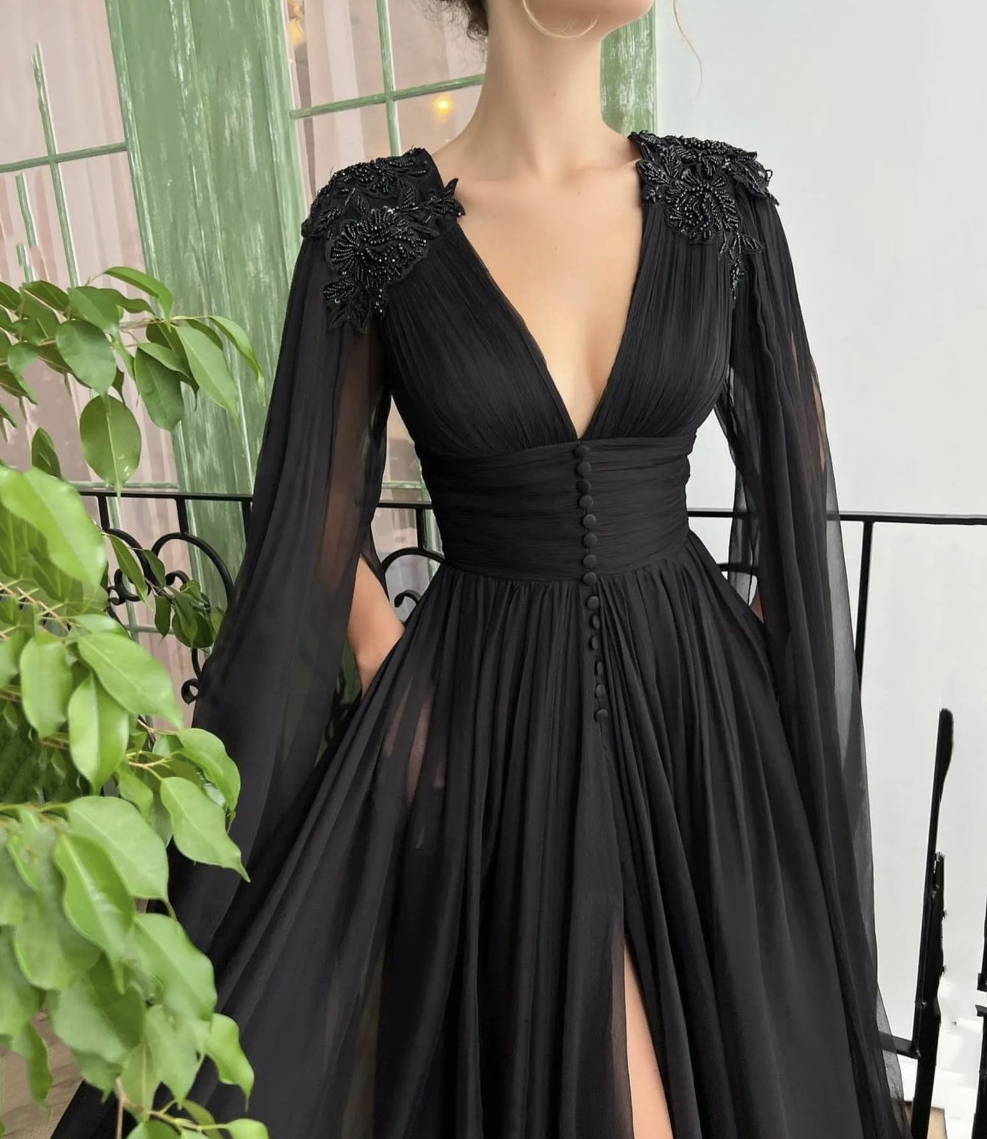 - Black V-neck chiffon long prom dress A-line evening dress -
