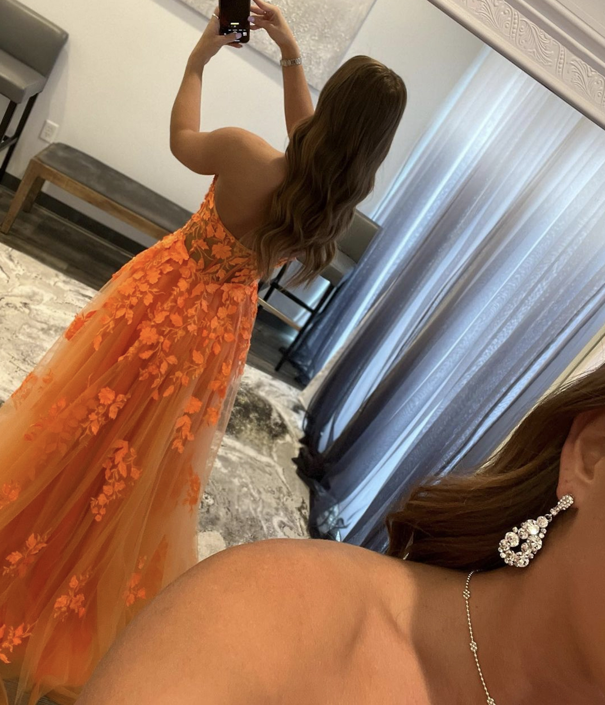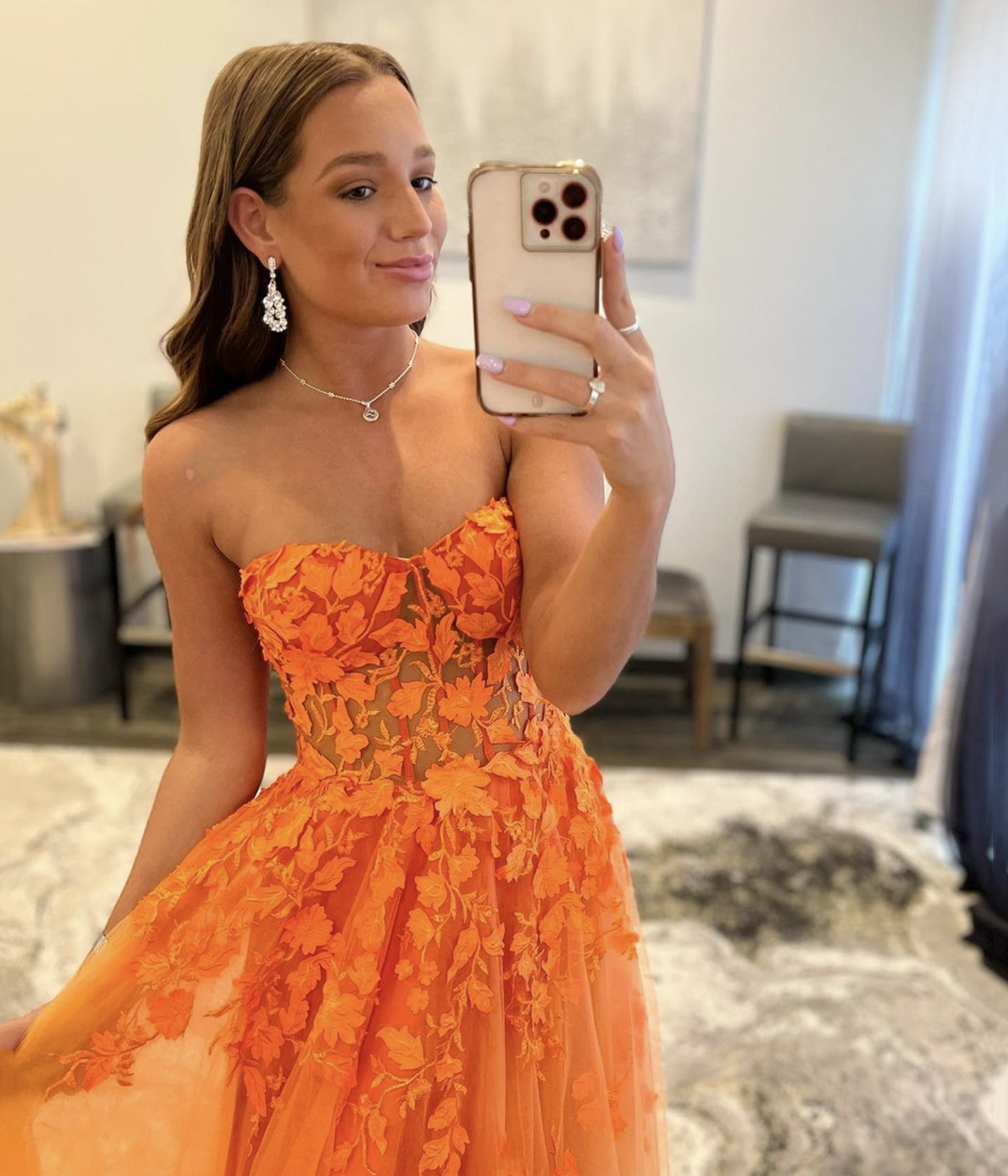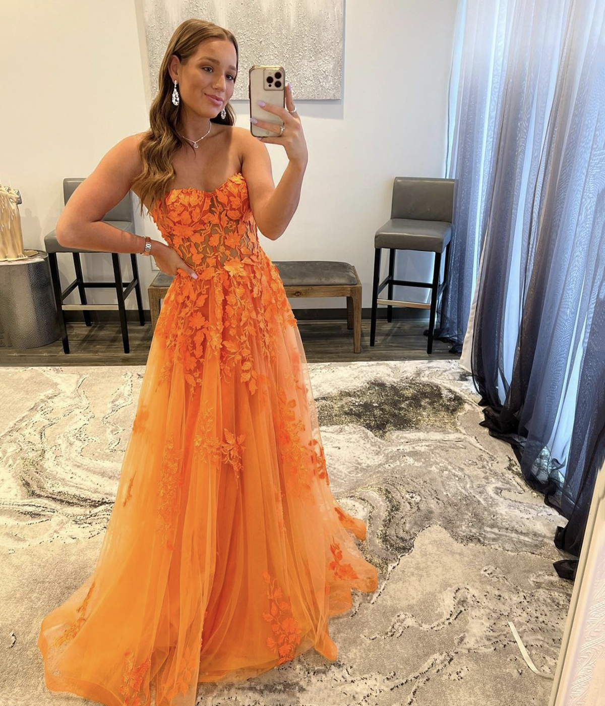 - Orange Strapless Tulle Long Prom Dress with Lace, A-Line Evening Dress -