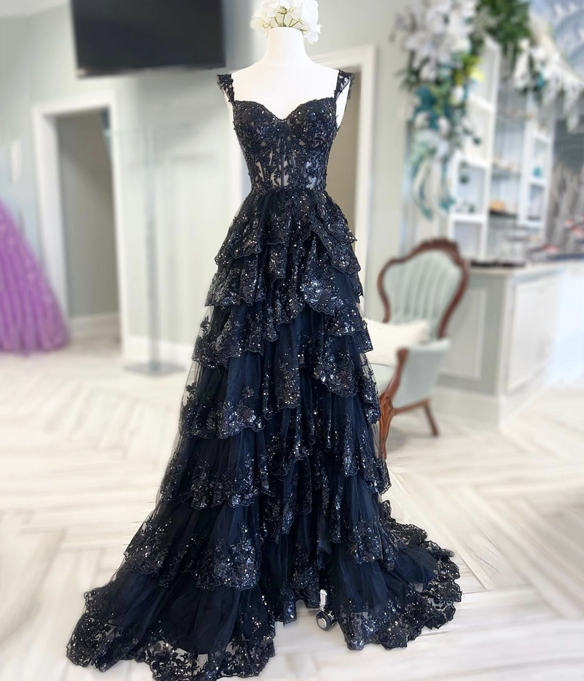 Black Tulle Sequins Long Prom Dress, Off Shoulder Evening Party Dress