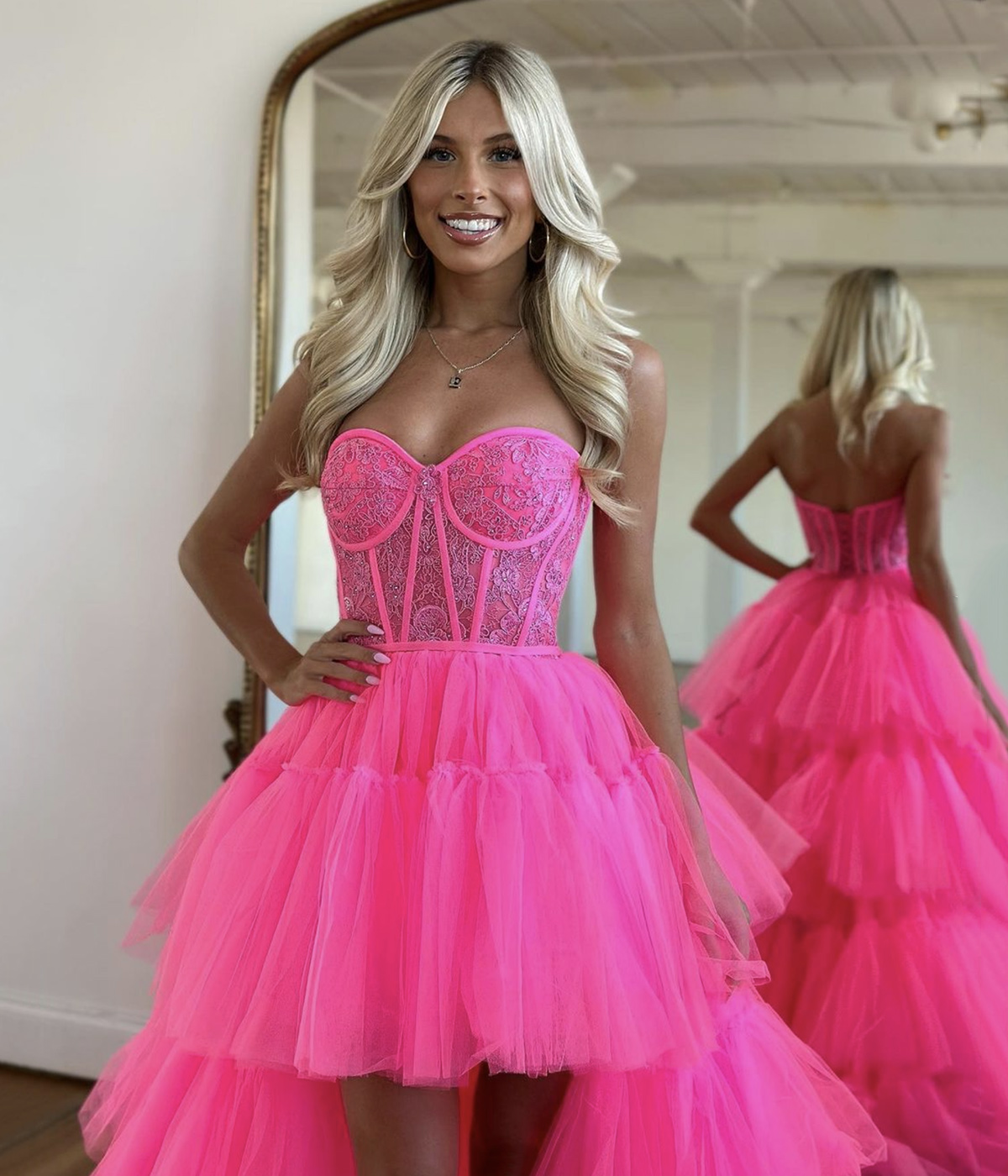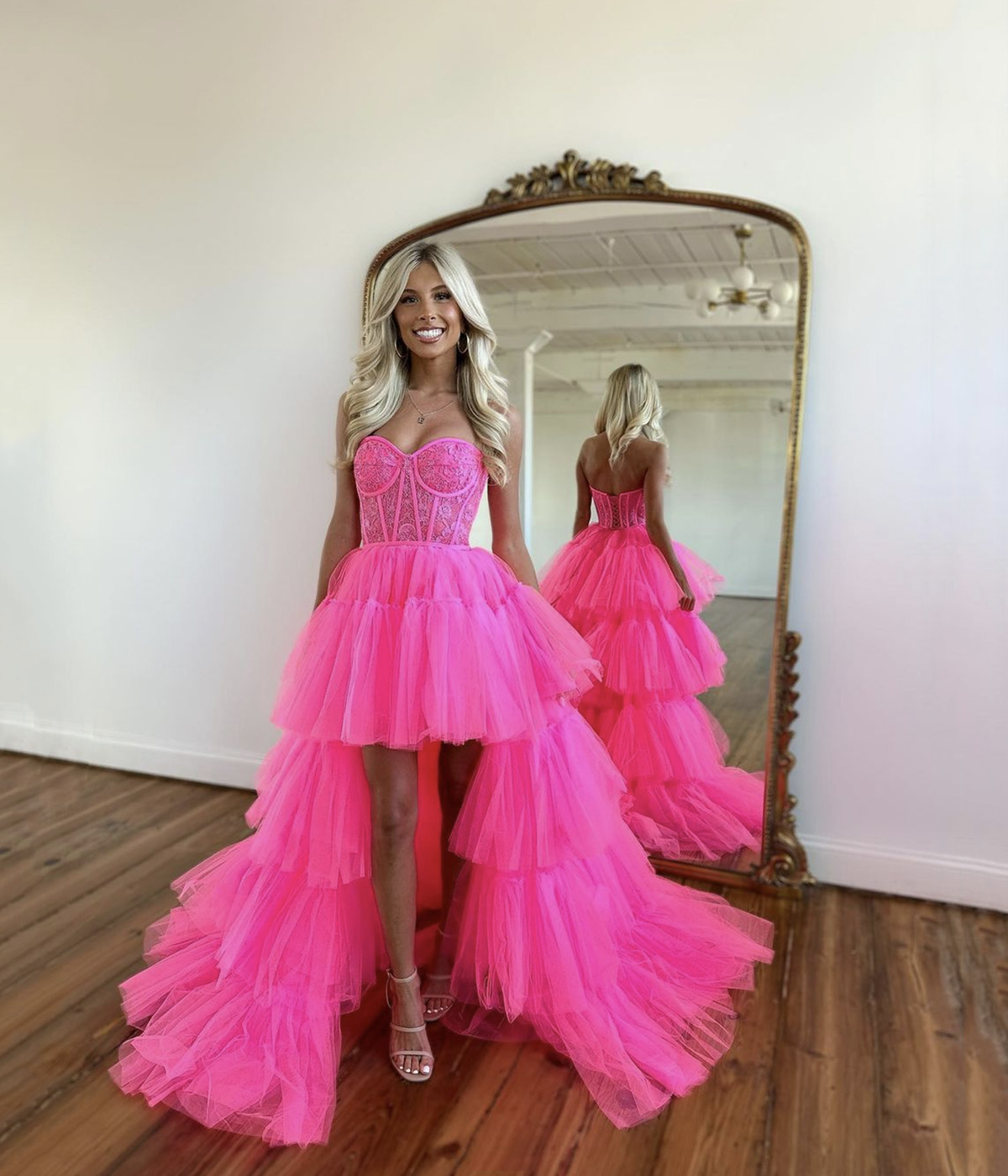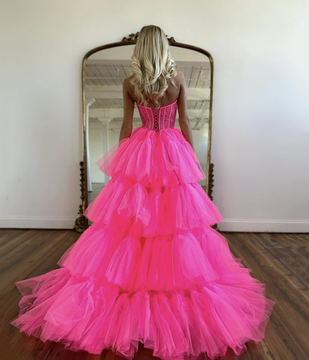 - Hot Pink High Low Sweetheart Tiered Prom Dress -