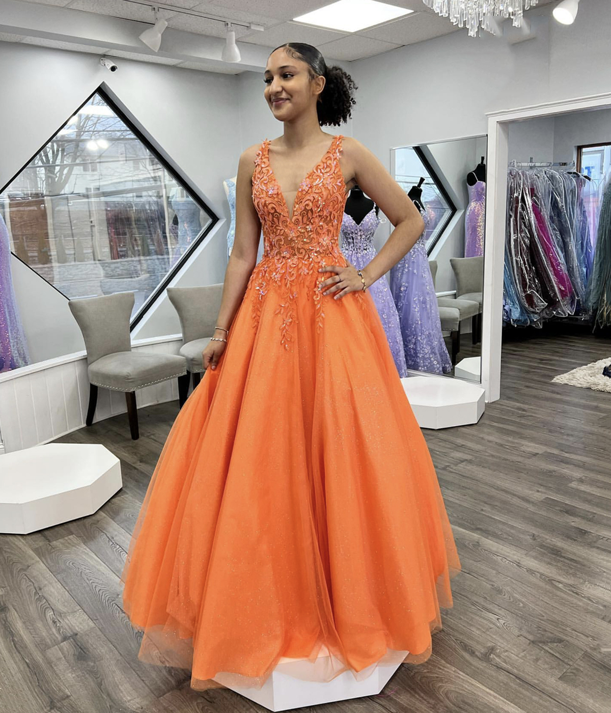 - Orange V-Neck Lace Long Prom Dress, Beautiful A-Line Evening Dress -
